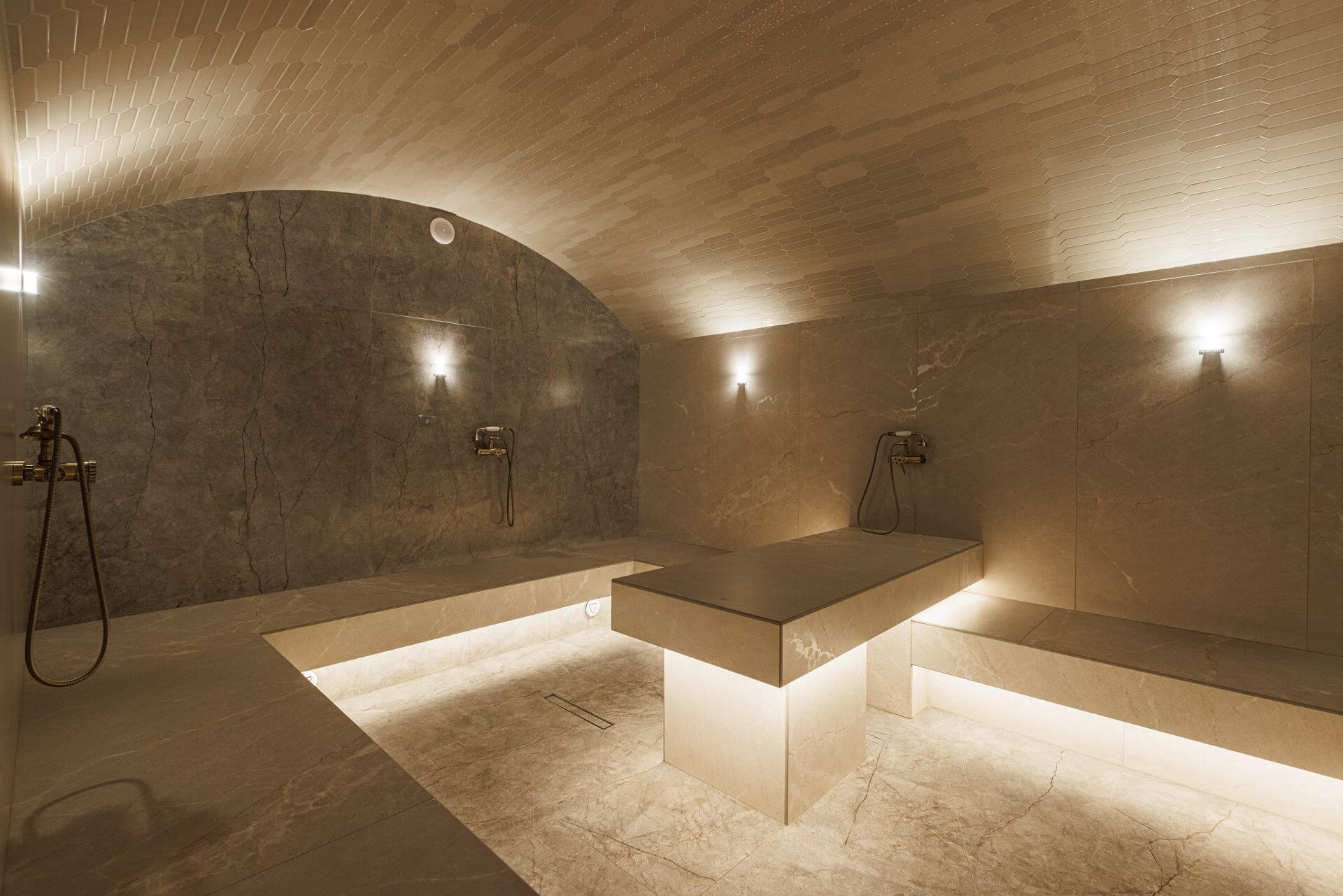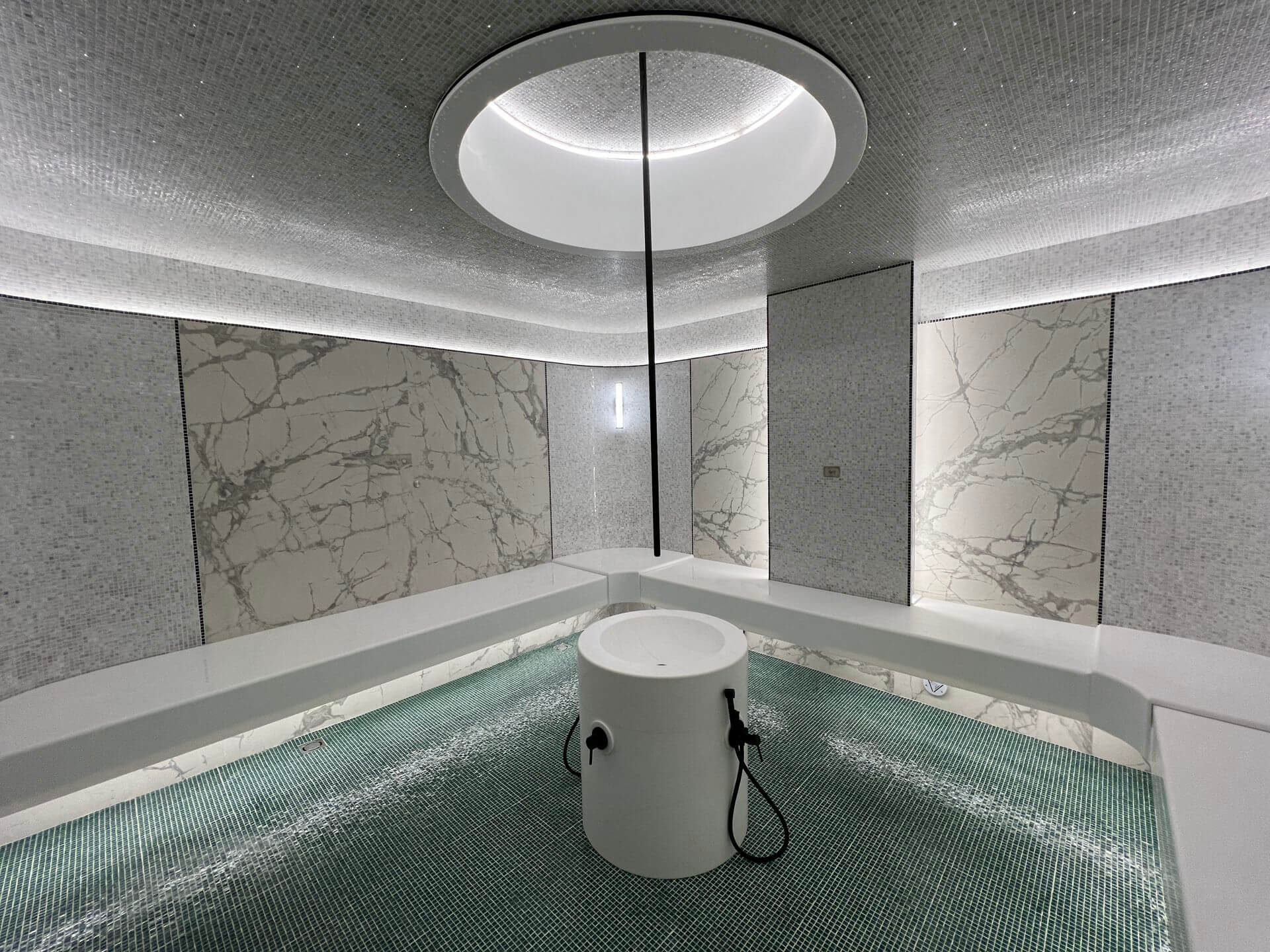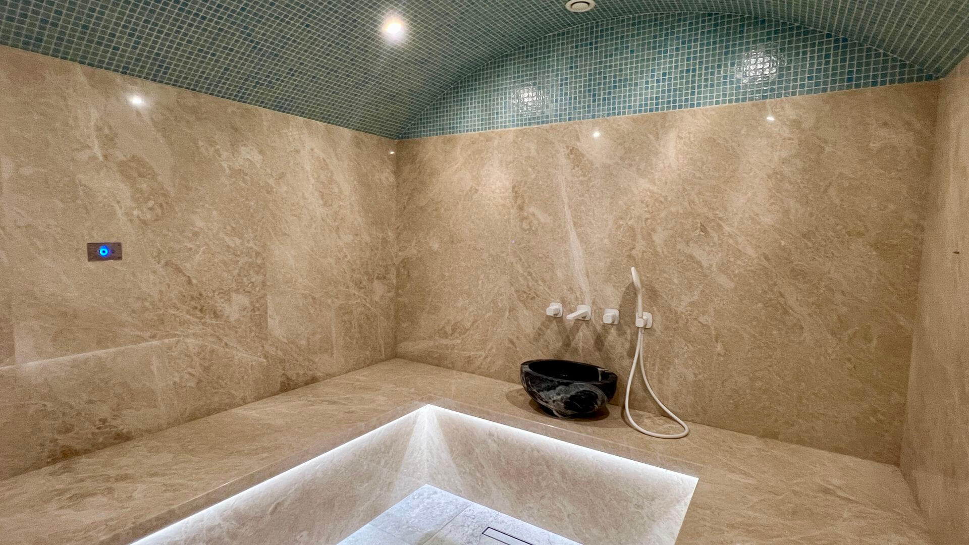 Хаммам — восточная традиция наслаждения и отдыха. Турецкая паровая баня славится атмосферой расслабления и особой эстетикой. Интерьер оформляется с применением натурального камня, стены украшают мозаичные элементы, а вдоль периметра располагаются тёплые каменные скамьи. Мягкий влажный пар, наполненный ароматами масел и благовоний, окутывает пространство, создавая атмосферу уюта и роскоши.